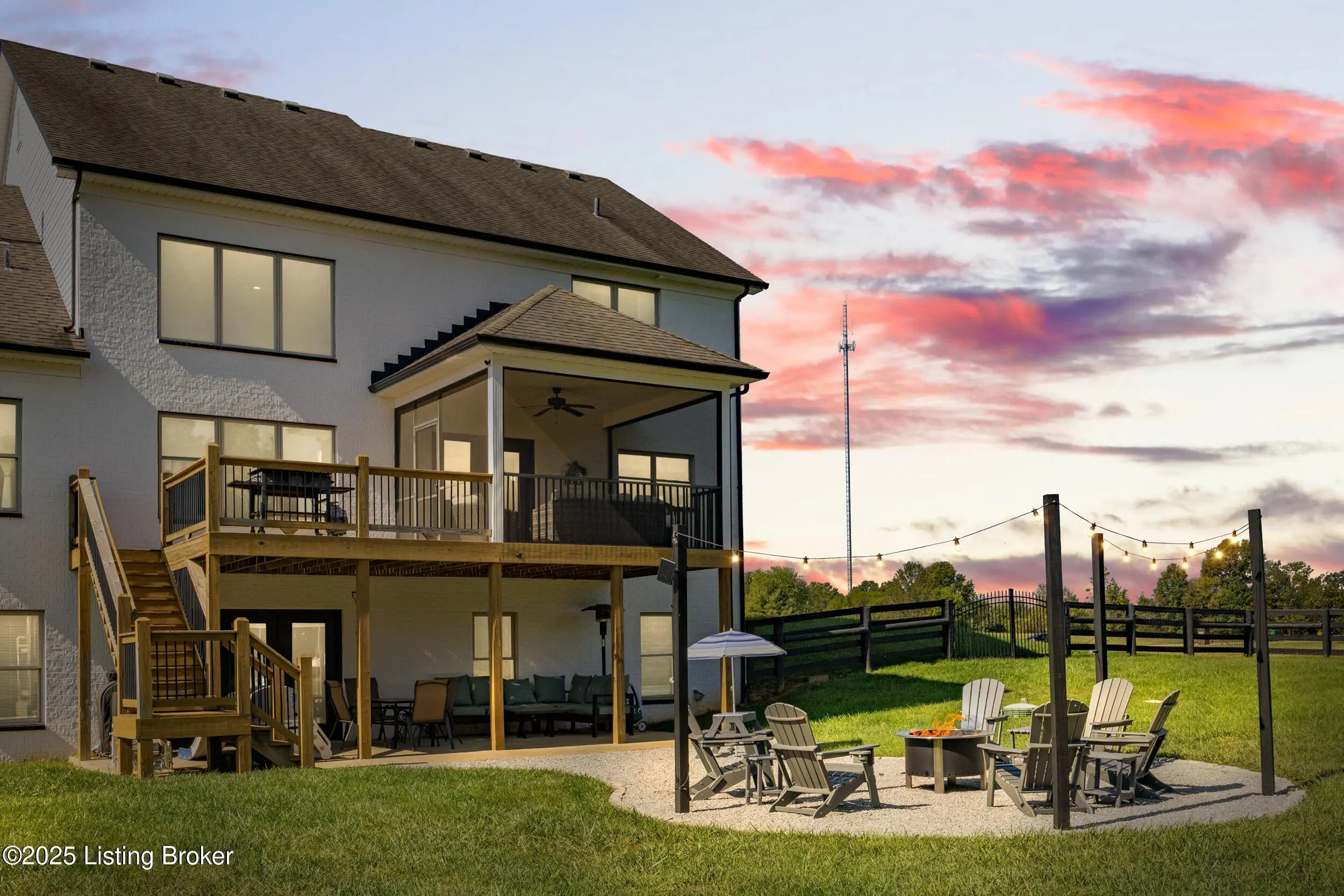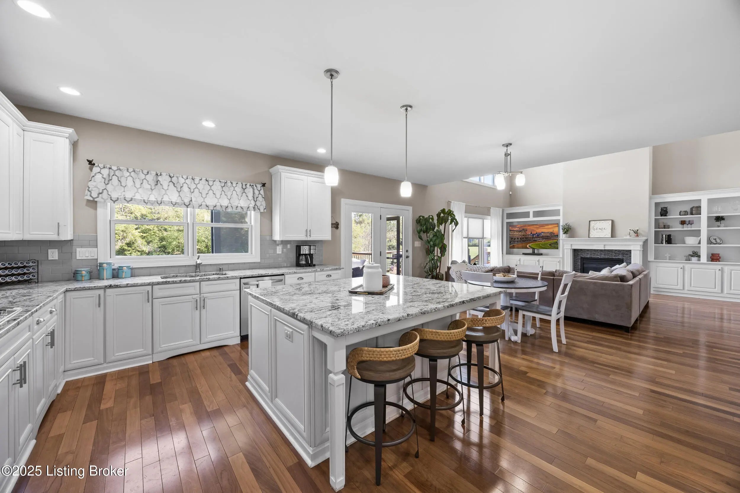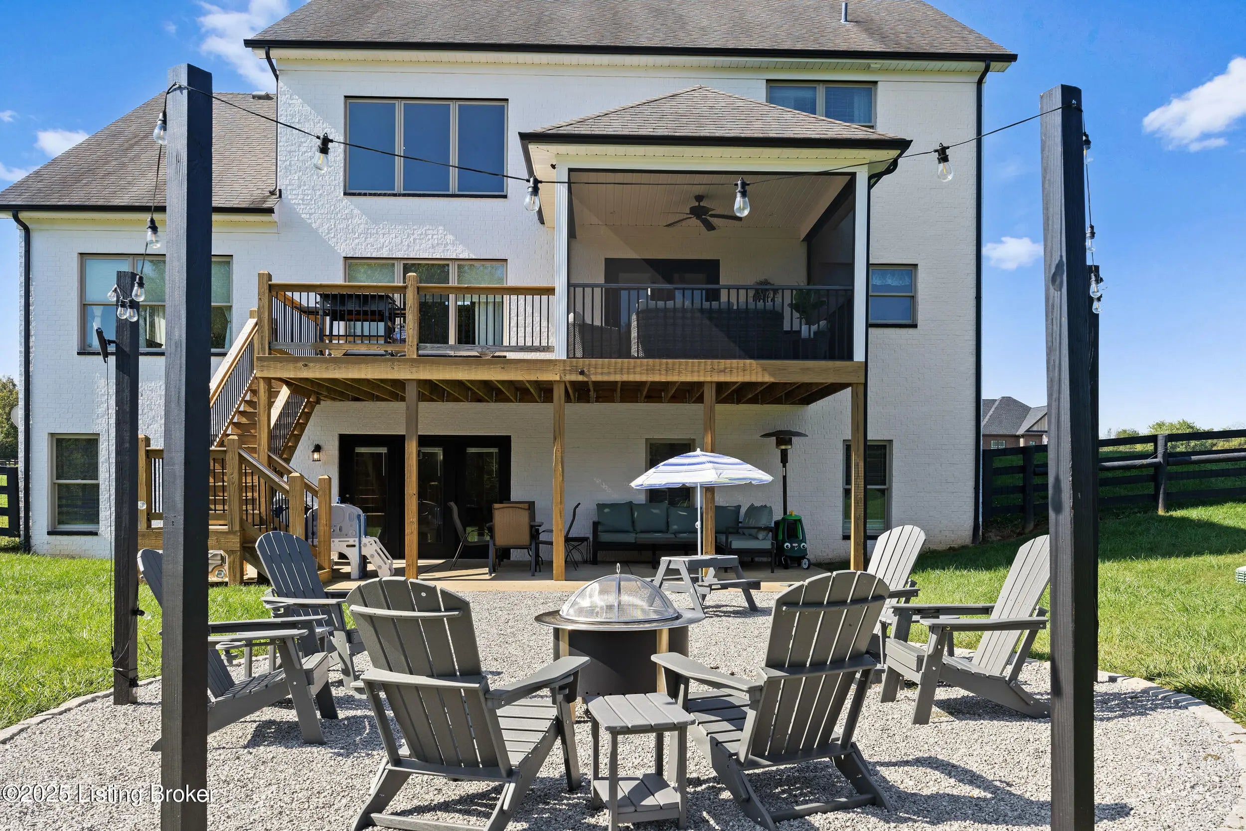 Welcome to this stunning 5-bedroom, 4.5-bath custom-built home, nestled on a picturesque 5-acre lot in the prestigious Overlook at Persimmon Ridge. This stunning property offers the perfect blend of luxury, comfort, and natural beauty — with the back portion of the lot beautifully wooded for added privacy and scenic views. As you enter through the soaring front entryway, you're greeted by a spacious open floor plan filled with natural light. The living room features vaulted ceilings, a cozy gas fireplace, and custom built-in cabinetry — seamlessly flowing into the super-sized kitchen equipped with an abundance of cabinetry, exquisite granite countertops, a massive center island, and a convenient built-in desk/computer area. The main-level owner's suite is a peaceful retreat overlooking the rear of the property. It boasts a spa-like en suite bath with double vanities, a large walk-in shower, a whirlpool tub, and a generous walk-in closet. Also on the main level: a formal dining room with gleaming hardwood floors, a well-equipped laundry room with utility sink and linen closet, and a stylish powder room for guests. Step outside to enjoy the large, fenced-in backyardperfect for entertaining or relaxingwith a screened-in covered deck just off the kitchen, offering year-round comfort and scenic views. Upstairs, you'll find a cozy loft/common area and three spacious bedrooms, each with large walk-in closets and plenty of natural light. One of the bedrooms features its own private en suite bath, while the others share a beautifully designed full bath with double vanities. The finished walk-out basement provides even more living space, including a home office, media room with built-in surround sound, a 5th bedroom, full bath, and a versatile flex room. One area is already plumbed and finished for a potential second kitchenideal for multi-generational living or entertaining. Walk right out onto the covered patio and into the expansive backyard, perfect for play, pets, and peaceful evenings. Additional features include a three-car garage, plenty of storage throughout, and the perfect setting for outdoor activities like campouts under the stars in your own wooded area. Conveniently located just minutes from the Old Henry Road exit and close to Shelbyville, Westport, and Brownsboro Roads, this home offers quick access to shopping, dining, and top Louisville destinations. Plus, you're just minutes from Beckley Creek Park, where you can enjoy biking, walking, kayaking, and fishing. Don't miss your opportunity to own this private paradise in one of the area's most sought-after neighborhoods. Reach out today to schedule your private tour!