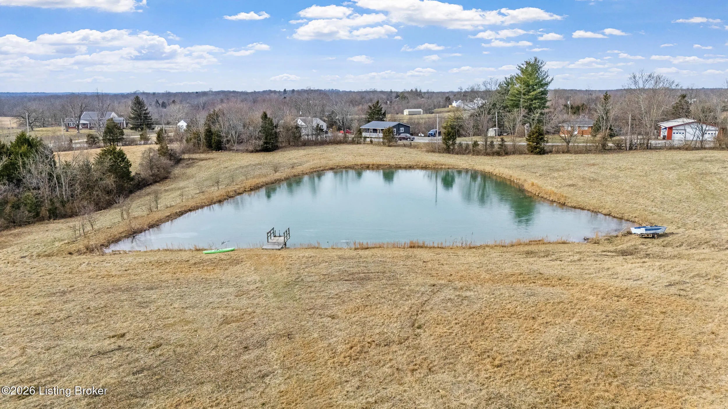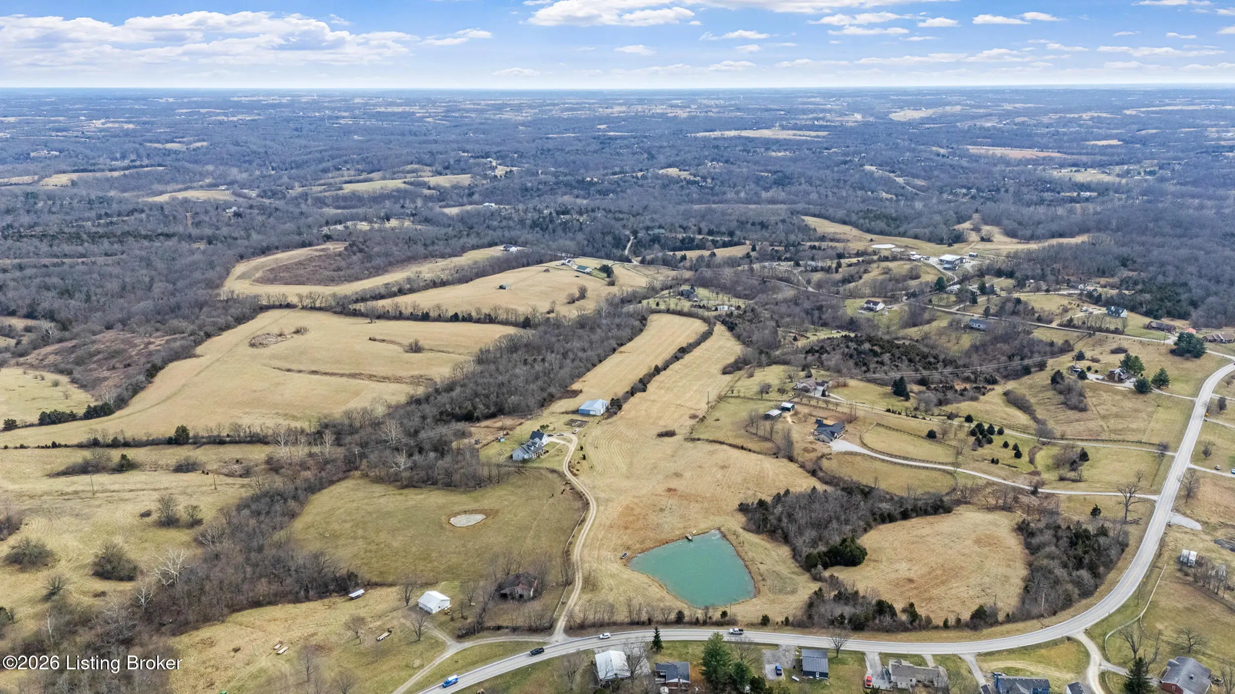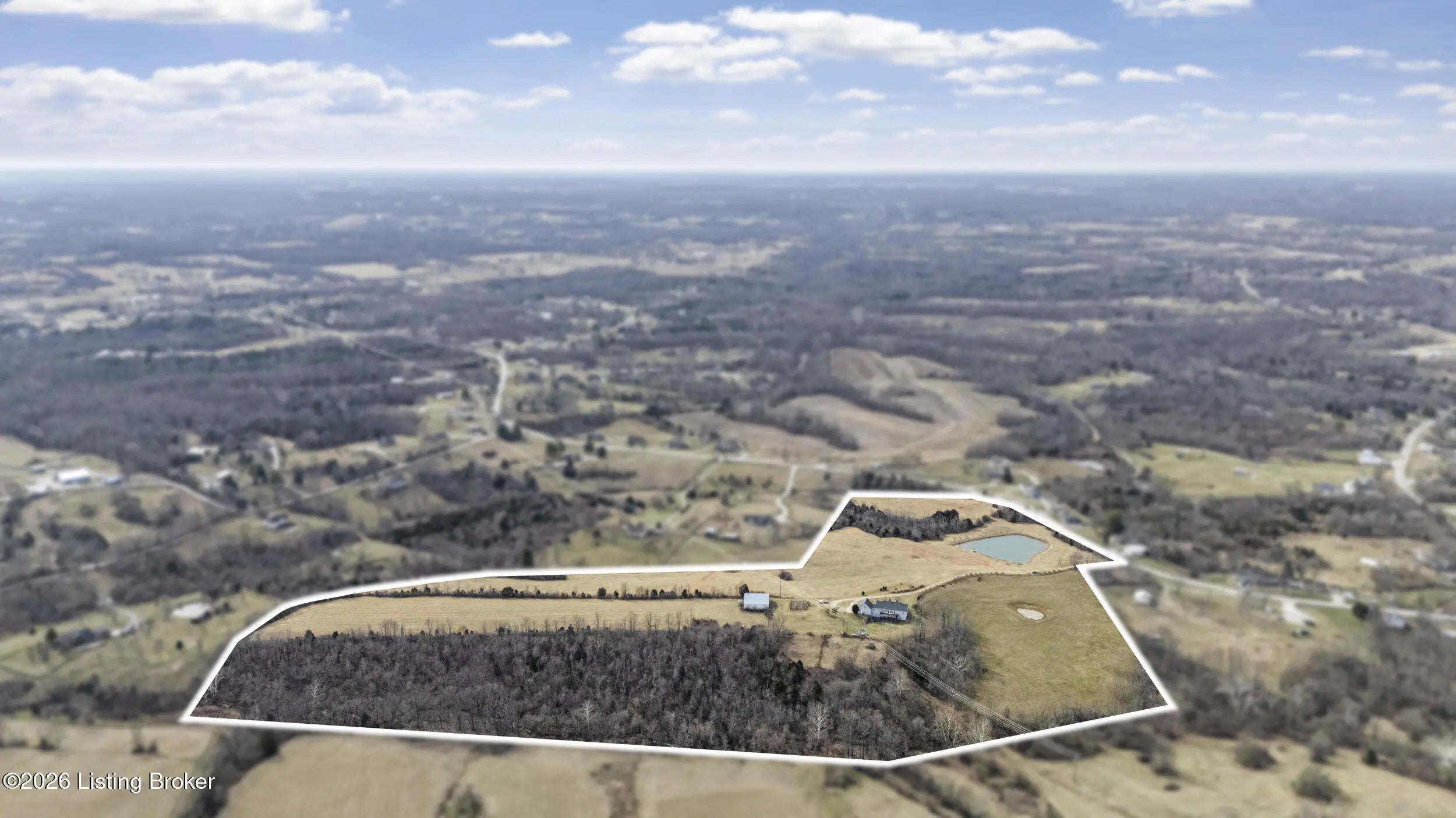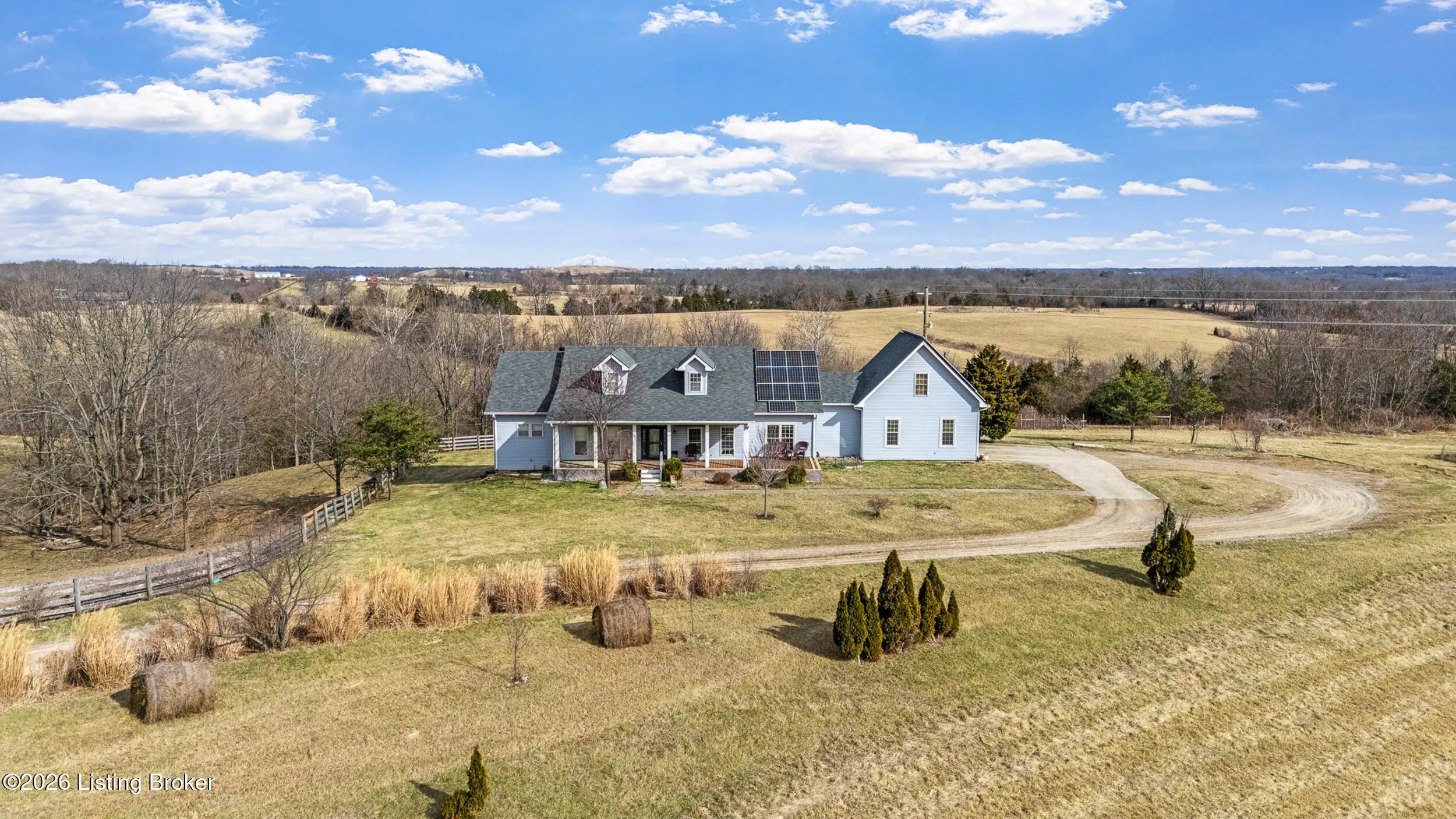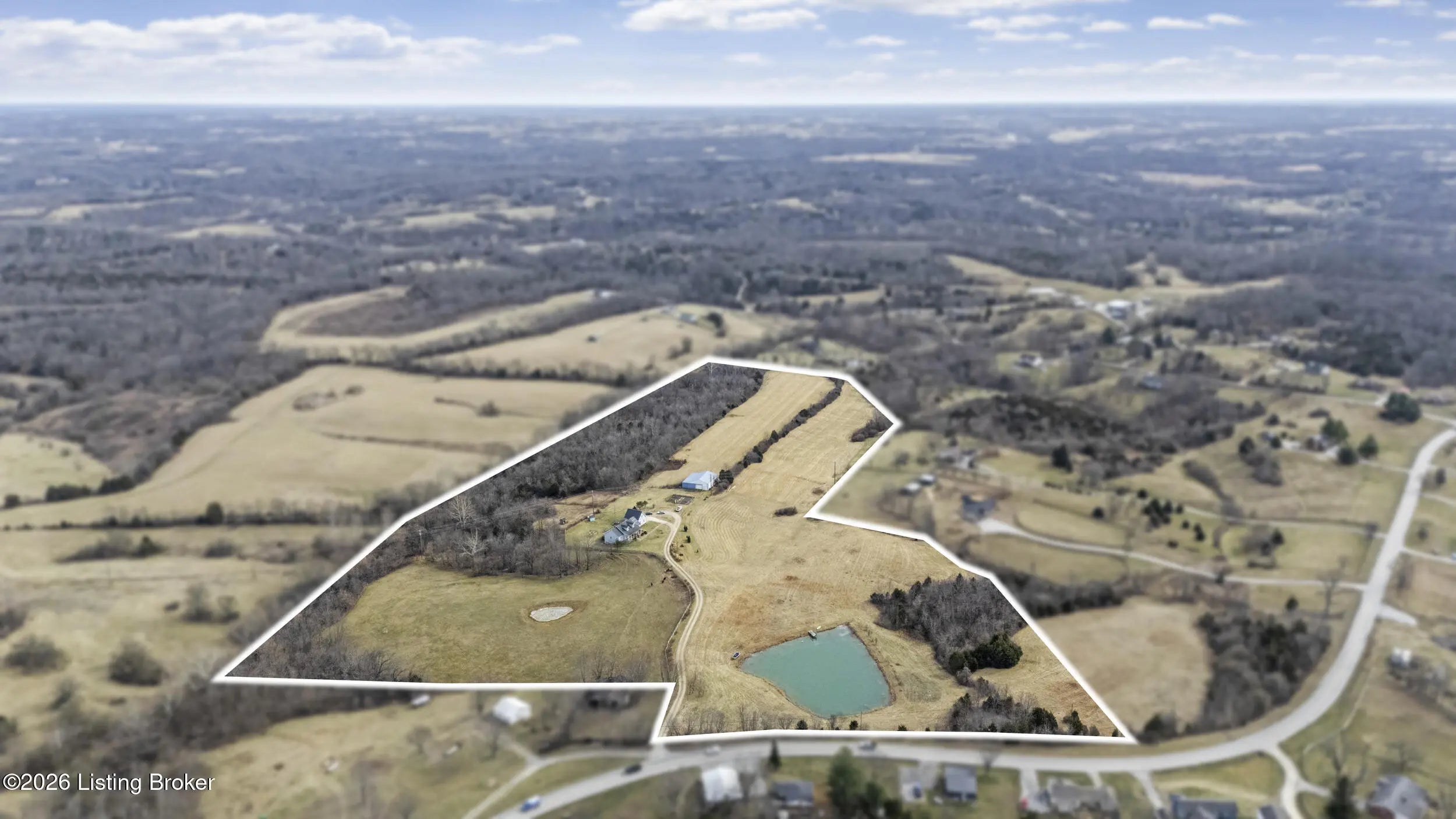 This exceptional cape cod style walkout ranch on over 33 acres offers far more than you ever expected—and everything you didn't know you needed. With over 4200 square feet of finished living space, this five-bedroom, three-full-bath home is thoughtfully designed for both everyday living and large gatherings. Energy efficiency is a standout feature, with geothermal heating and solar panels significantly reducing utility costs. A covered front porch welcomes you inside, where an open-concept family room and dining area flow seamlessly into the kitchen—ideal for entertaining. Built-in bookcases frame the media center in the family room, adding both function and charm. Off the family room is a deck that extends the length of the home, perfect for the amazing views overlooking the back 33 acres. A first-floor bedroom with dual access offers excellent flexibility and is well-suited for in-law living or accessibility needs. The primary suite is a private retreat featuring a spacious walk-in closet and an en-suite bath with separate double vanities. A third first-floor bedroom is tucked away, generously sized for oversized furniture, and offers peaceful views of the front acreage. A full bath on the main level connects to an oversized laundry and mudroom with exceptional storage. The walkout lower level is equally impressive, featuring a massive second family room with windows overlooking the rear of the property and direct access to a private patio. This space easily accommodates a dining area, media room, exercise space, or all three. Two additional bedrooms, each with walk-in closets, and a full bath complete the finished lower level. Storage is abundant throughout the home, including a second large pantry near the stairwell, two distinct unfinished basement spaces, oversized bedroom closets, and extensive mudroom storage. The garage offers ample room for vehicles and equipment, plus a substantial walk-up attic for even more storage. The land itself is extraordinary: a former cattle pasture, a fishing pond at the entrance, a large outbuilding, former chicken coop, garden areas, and wooded acreageoffering endless possibilities for recreation, farming, or simply enjoying wide-open space. The 33 acres are complemented by an additional 5-acre parcel, deeded separately and available for purchase independently. Conveniently located just minutes from the highway and across from the entrance to the prestigious L'Esprit Estates, this ranch-style Cape Cod combines privacy, efficiency, and scale in a truly rare offering. All of this is ideally situated just off the I-71 corridor, right on the border of Oldham and Henry Countiesprivacy, convenience, and versatility in one remarkable property.