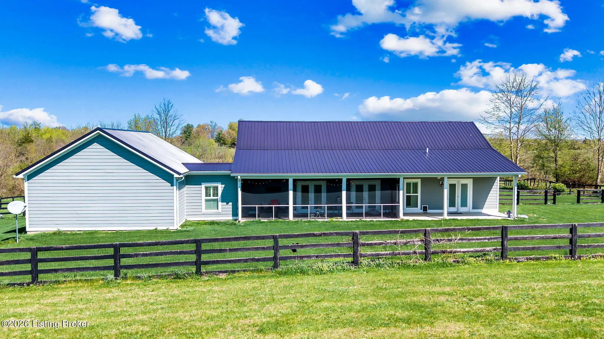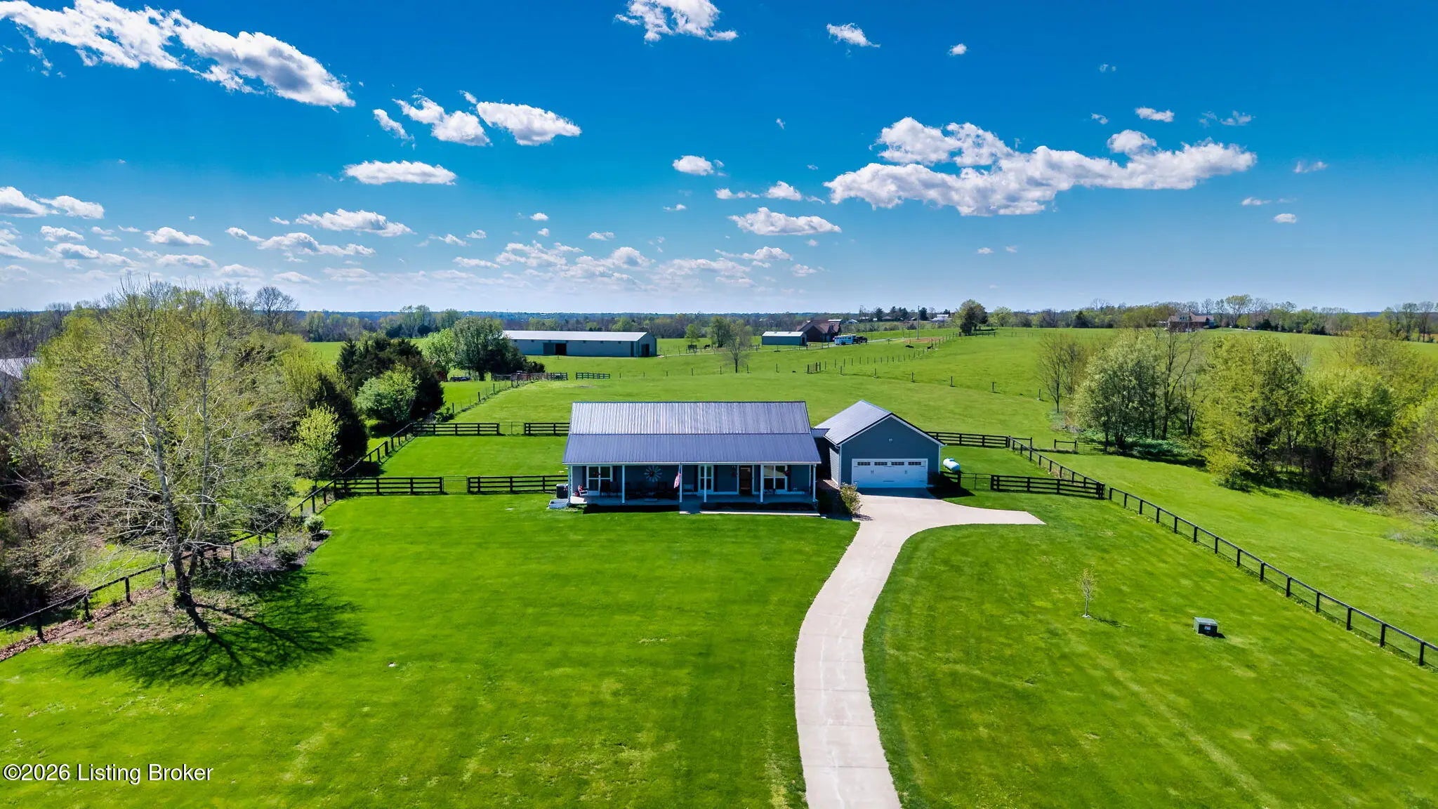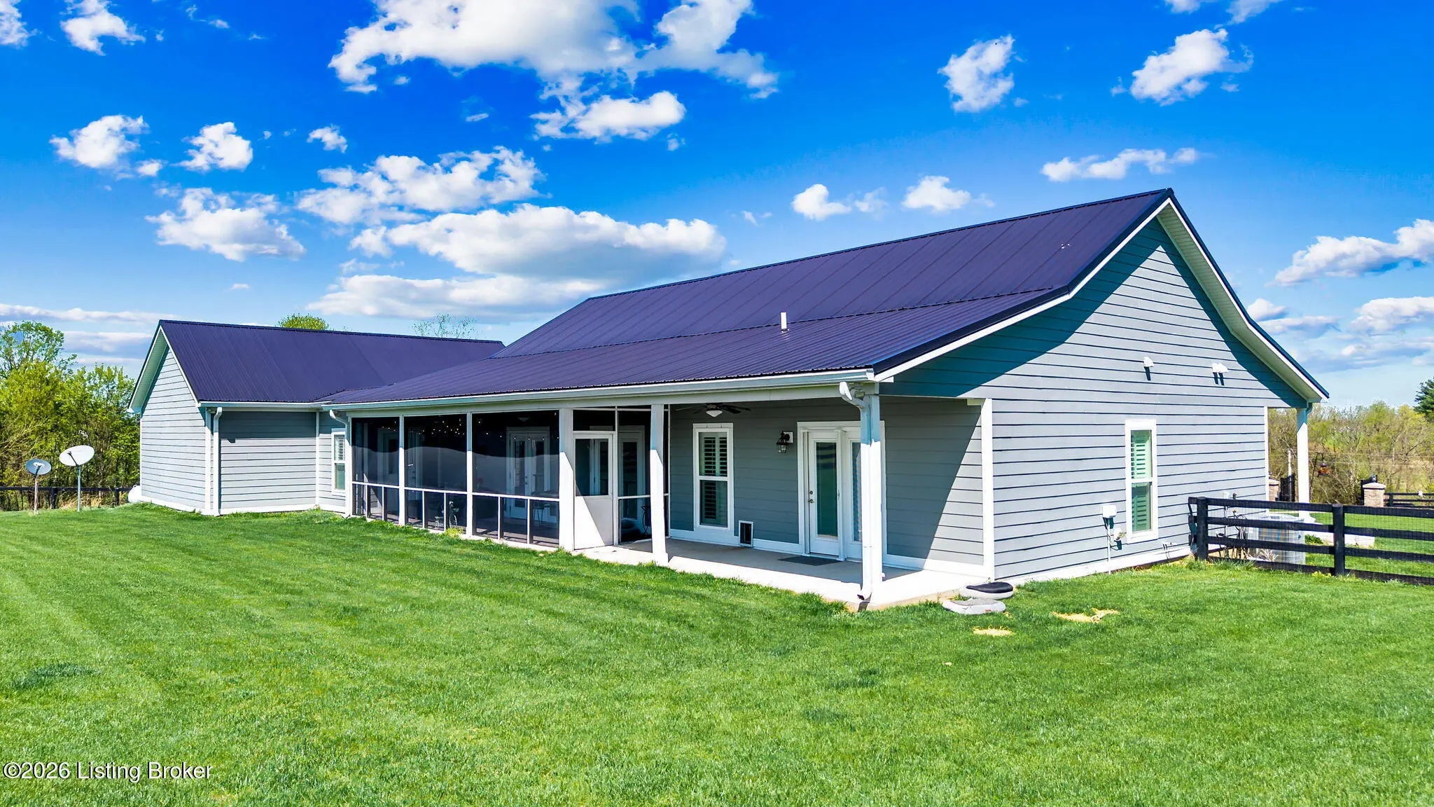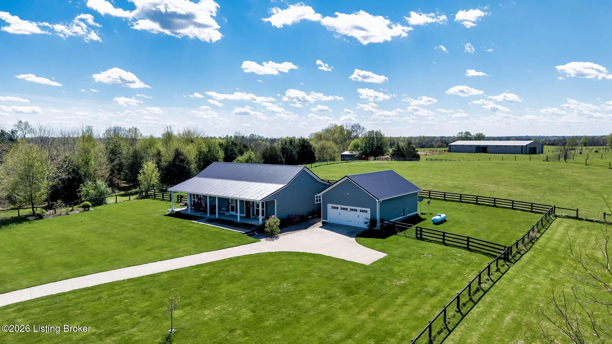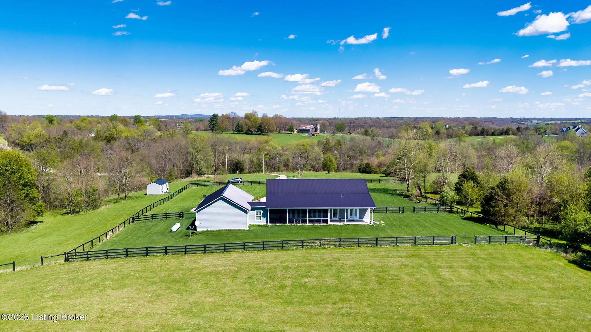 Welcome to your own private slice of Kentucky paradise, this like-new ranch home, built in 2017 and set on 5.5 beautiful acres in Shelby County, offers the perfect blend of modern comfort, low-maintenance living, and peaceful surroundings. From the moment you arrive, you'll appreciate the thoughtfully designed, maintenance-free exterior featuring durable Hardie plank siding and a metal roof built to last. The fully fenced front yard, complete with remote controlled gate and irrigation system, creates a picture-perfect setting while offering both security and convenience. A charming front porch invites you to relax and take in the serene views, while the screened-in back patio overlooks open pasture and wooded areas, ideal for unwinding or entertaining. Inside, the home showcases a bright, open floor plan with wide-plank LVP flooring, plantation shutters, abundant recessed lighting, and upgraded fixtures throughout. The heart of the home is the stunning kitchen, featuring custom cabinetry, exceptional storage, a large center island, and high-end stainless steel appliances, including a 36-inch gas range, double ovens, refrigerator, and a secondary beverage fridge. The kitchen flows seamlessly into the vaulted great room, where a cozy gas fireplace and expansive space create the perfect gathering area. The spacious primary suite is a true retreat, highlighted by a double tray ceiling and direct access to the back patio. The luxurious en suite bath features a large tiled walk-in shower with bench seating, a soaking tub, and an oversized walk-in closet. Two additional bedrooms are generously sized, and the 2nd bathroom offers another large walk-in shower with quality finishes. Additional features include a large two-car garage with a dedicated storage area, pull-down attic access with floored storage space, and a versatile outbuilding perfect for lawn equipment, or easily transformed into a workshop or "she shed." Enjoy the peace and privacy of country living without sacrificing convenience. Ideally located near Shelbyville, Simpsonville, Taylorsville, I-64, the Gene Snyder Freeway, and an abundance of shopping, dining, parks, and family activities, this property truly offers the best of both worlds. Homes like this don't come around often, schedule your private showing today and experience it for yourself.