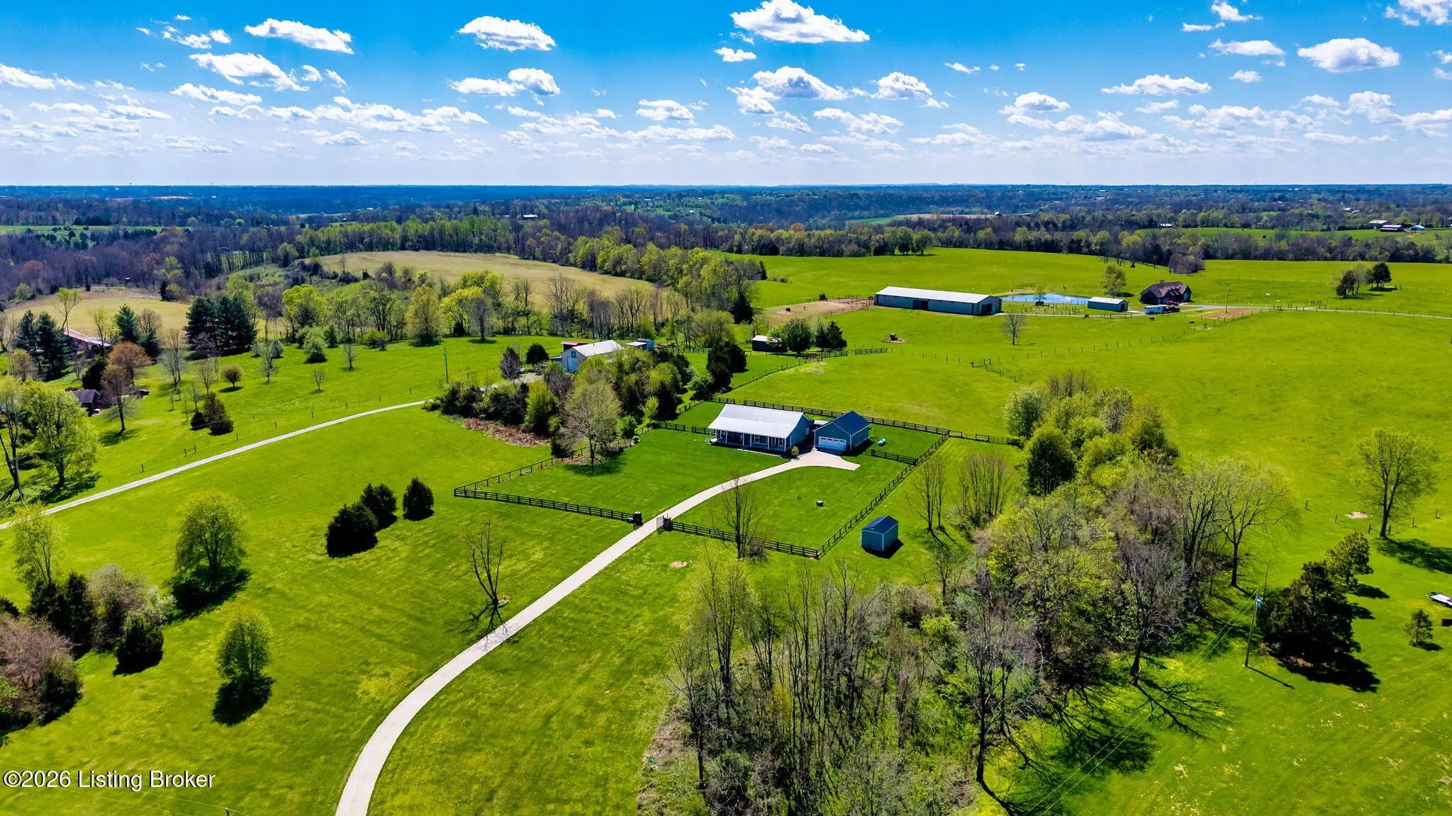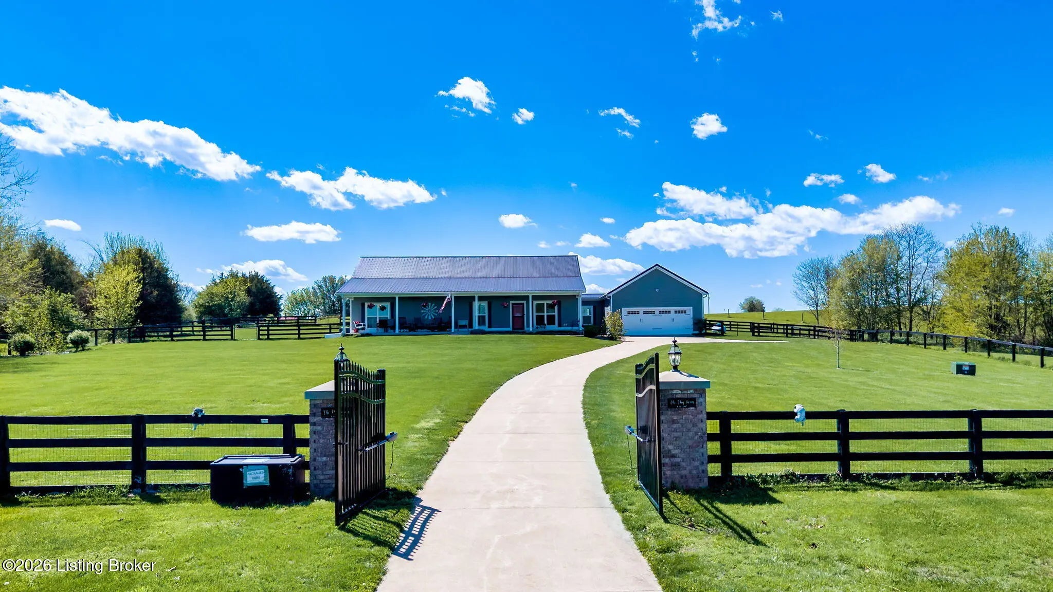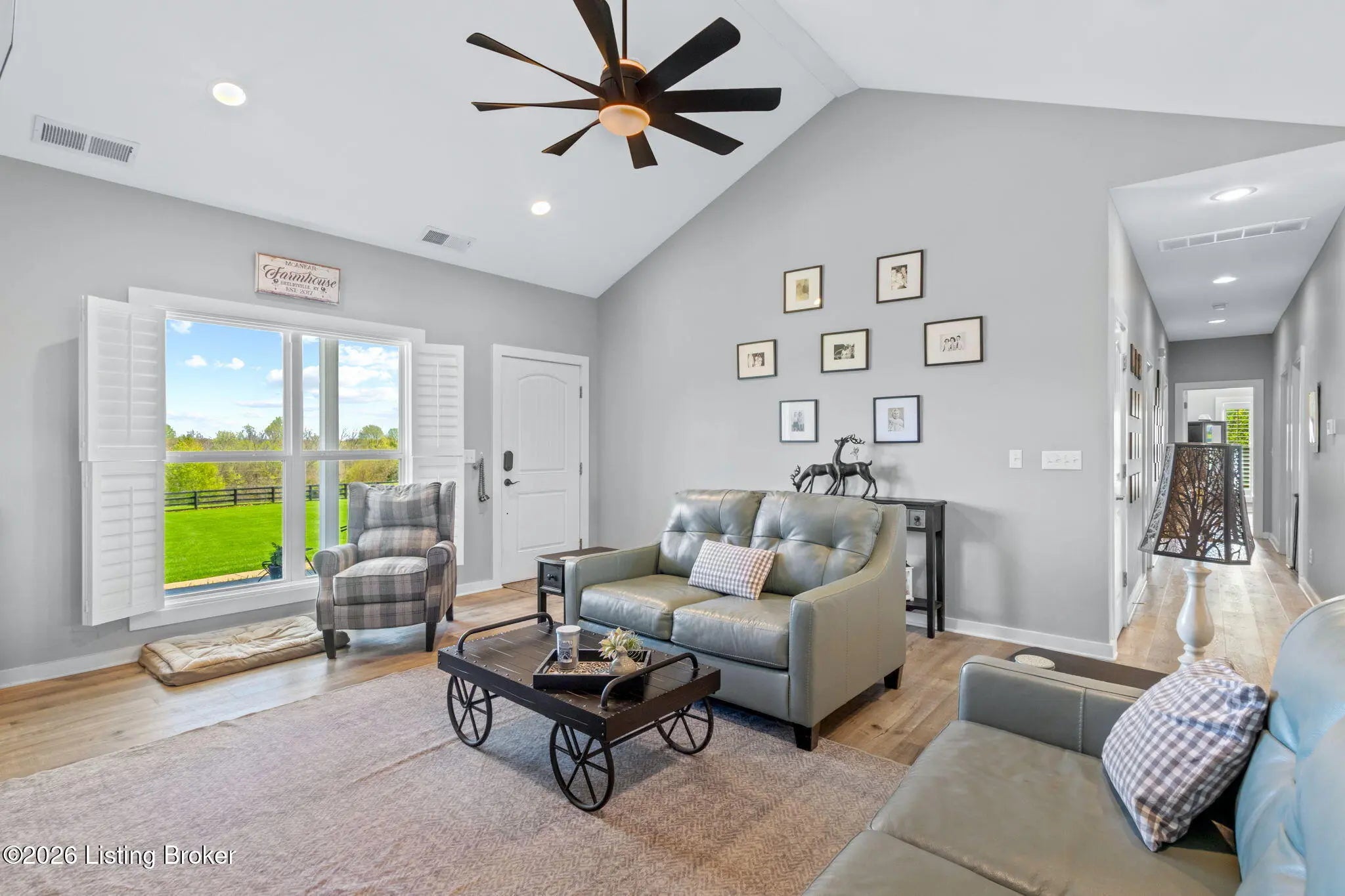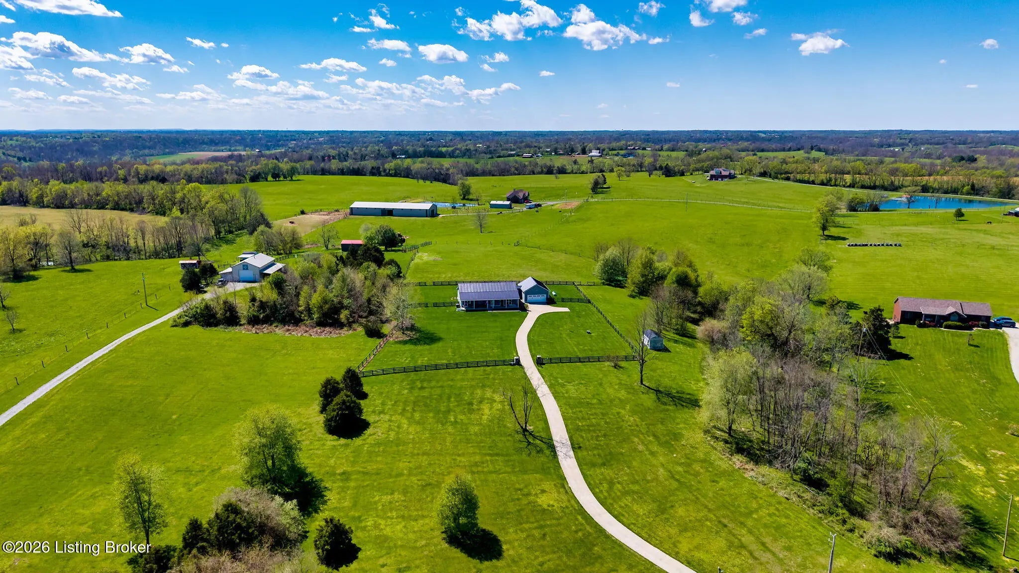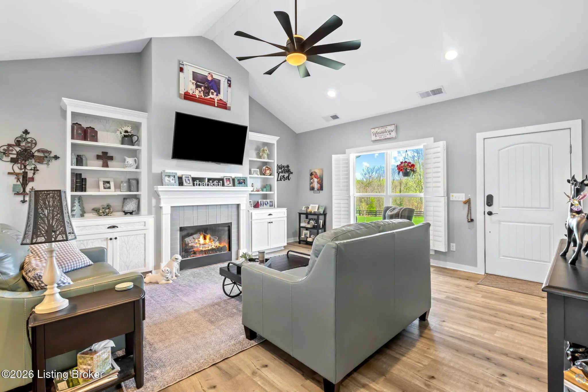 Welcome to your own private slice of Kentucky paradise, this like-new ranch home, built in 2017 and set on 5.5 beautiful acres in Shelby County, offers the perfect blend of modern comfort, low-maintenance living, and peaceful surroundings. From the moment you arrive, you'll appreciate the thoughtfully designed, maintenance-free exterior featuring durable Hardie plank siding and a metal roof built to last. The fully fenced front yard, complete with remote controlled gate and irrigation system, creates a picture-perfect setting while offering both security and convenience. A charming front porch invites you to relax and take in the serene views, while the screened-in back patio overlooks open pasture and wooded areas, ideal for unwinding or entertaining. Inside, the home showcases a bright, open floor plan with wide-plank LVP flooring, plantation shutters, abundant recessed lighting, and upgraded fixtures throughout. The heart of the home is the stunning kitchen, featuring custom cabinetry, exceptional storage, a large center island, and high-end stainless steel appliances, including a 36-inch gas range, double ovens, refrigerator, and a secondary beverage fridge. The kitchen flows seamlessly into the vaulted great room, where a cozy gas fireplace and expansive space create the perfect gathering area. The spacious primary suite is a true retreat, highlighted by a double tray ceiling and direct access to the back patio. The luxurious en suite bath features a large tiled walk-in shower with bench seating, a soaking tub, and an oversized walk-in closet. Two additional bedrooms are generously sized, and the 2nd bathroom offers another large walk-in shower with quality finishes. Additional features include a large two-car garage with a dedicated storage area, pull-down attic access with floored storage space, and a versatile outbuilding perfect for lawn equipment, or easily transformed into a workshop or "she shed." Enjoy the peace and privacy of country living without sacrificing convenience. Ideally located near Shelbyville, Simpsonville, Taylorsville, I-64, the Gene Snyder Freeway, and an abundance of shopping, dining, parks, and family activities, this property truly offers the best of both worlds. Homes like this don't come around often, schedule your private showing today and experience it for yourself.