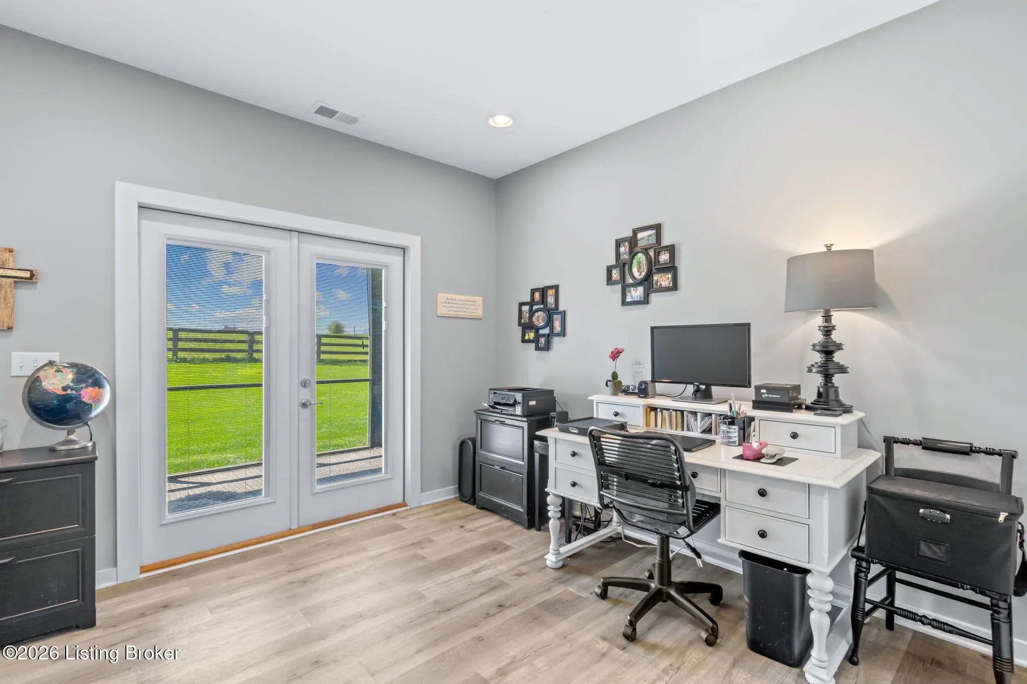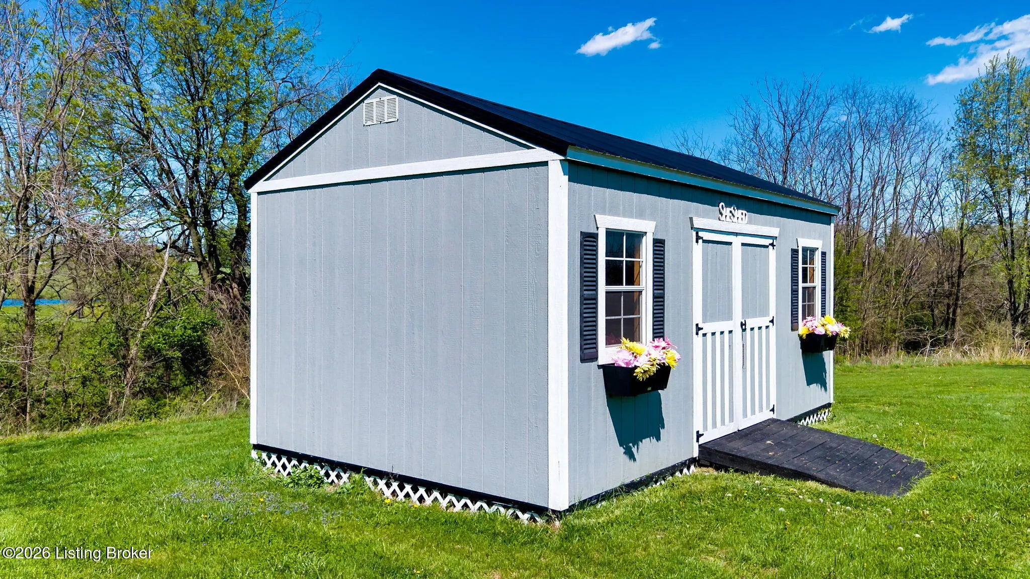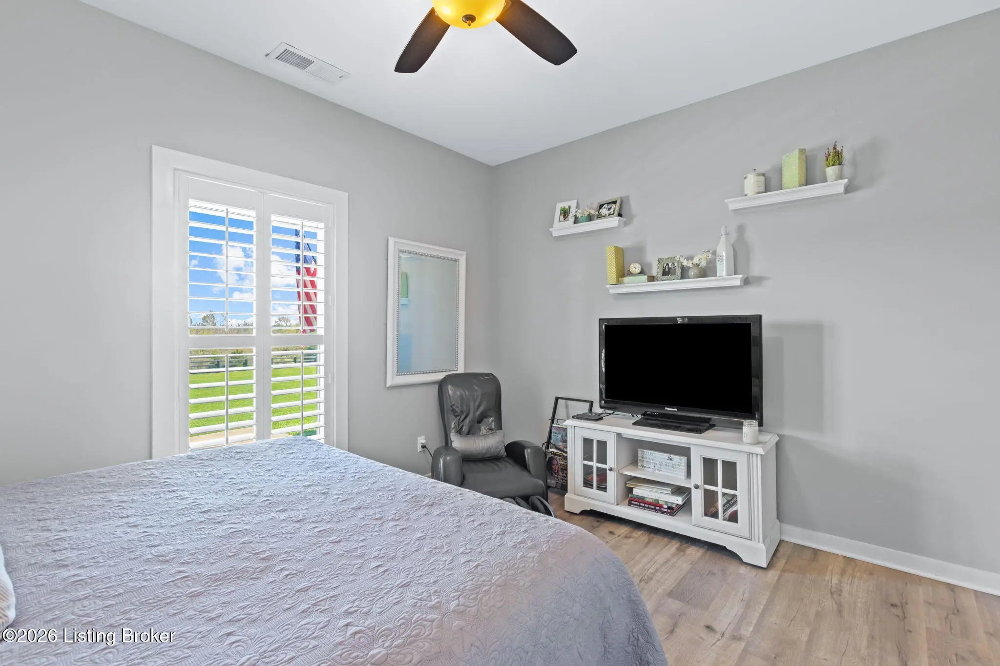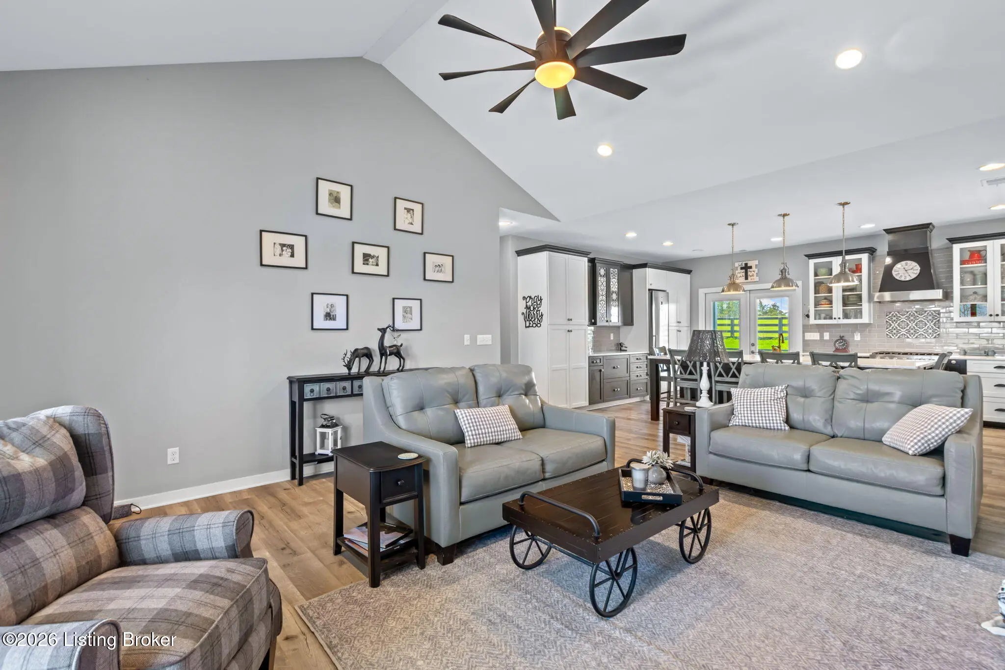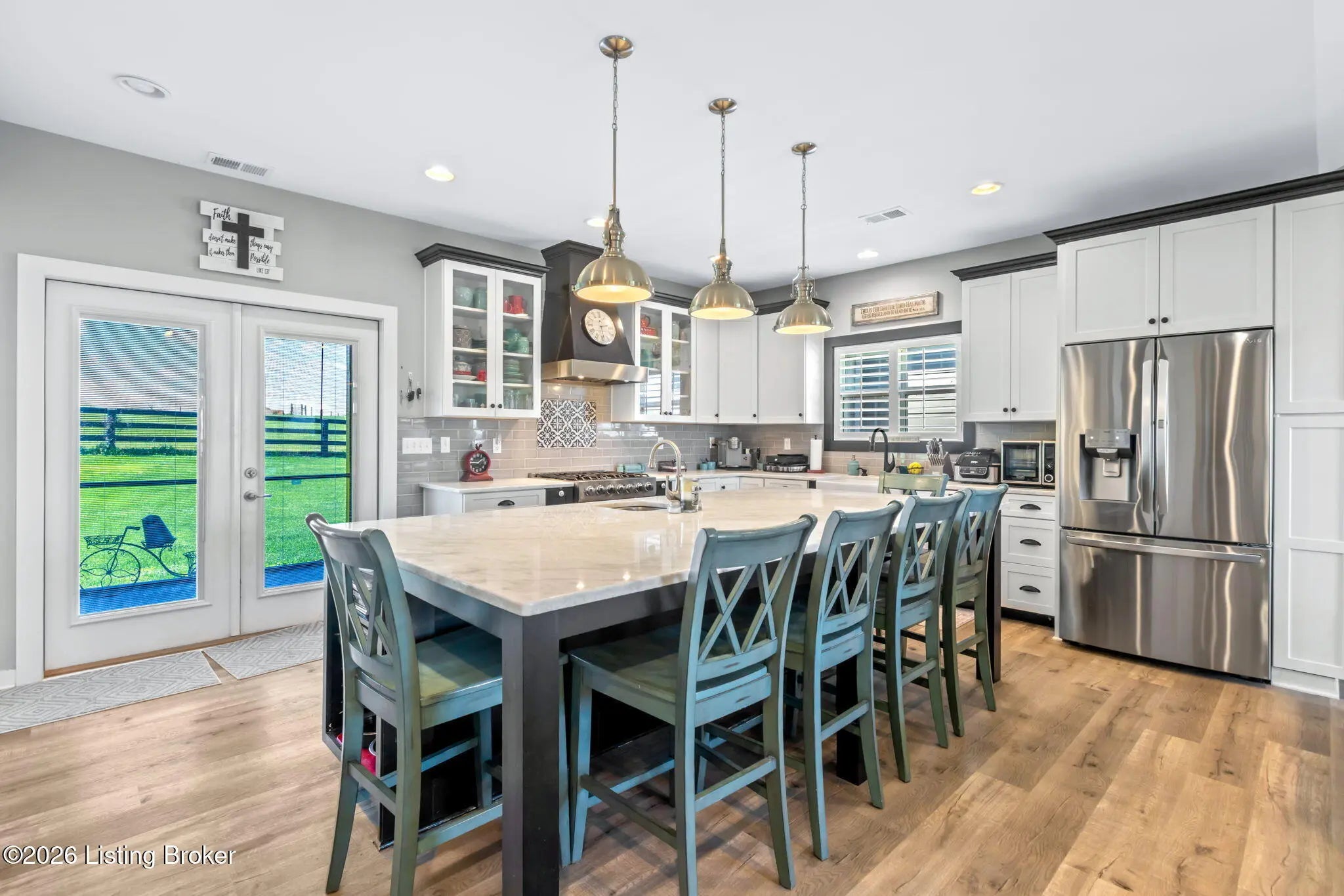 Welcome to your own private slice of Kentucky paradise, this like-new ranch home, built in 2017 and set on 5.5 beautiful acres in Shelby County, offers the perfect blend of modern comfort, low-maintenance living, and peaceful surroundings. From the moment you arrive, you'll appreciate the thoughtfully designed, maintenance-free exterior featuring durable Hardie plank siding and a metal roof built to last. The fully fenced front yard, complete with remote controlled gate and irrigation system, creates a picture-perfect setting while offering both security and convenience. A charming front porch invites you to relax and take in the serene views, while the screened-in back patio overlooks open pasture and wooded areas, ideal for unwinding or entertaining. Inside, the home showcases a bright, open floor plan with wide-plank LVP flooring, plantation shutters, abundant recessed lighting, and upgraded fixtures throughout. The heart of the home is the stunning kitchen, featuring custom cabinetry, exceptional storage, a large center island, and high-end stainless steel appliances, including a 36-inch gas range, double ovens, refrigerator, and a secondary beverage fridge. The kitchen flows seamlessly into the vaulted great room, where a cozy gas fireplace and expansive space create the perfect gathering area. The spacious primary suite is a true retreat, highlighted by a double tray ceiling and direct access to the back patio. The luxurious en suite bath features a large tiled walk-in shower with bench seating, a soaking tub, and an oversized walk-in closet. Two additional bedrooms are generously sized, and the 2nd bathroom offers another large walk-in shower with quality finishes. Additional features include a large two-car garage with a dedicated storage area, pull-down attic access with floored storage space, and a versatile outbuilding perfect for lawn equipment, or easily transformed into a workshop or "she shed." Enjoy the peace and privacy of country living without sacrificing convenience. Ideally located near Shelbyville, Simpsonville, Taylorsville, I-64, the Gene Snyder Freeway, and an abundance of shopping, dining, parks, and family activities, this property truly offers the best of both worlds. Homes like this don't come around often, schedule your private showing today and experience it for yourself.