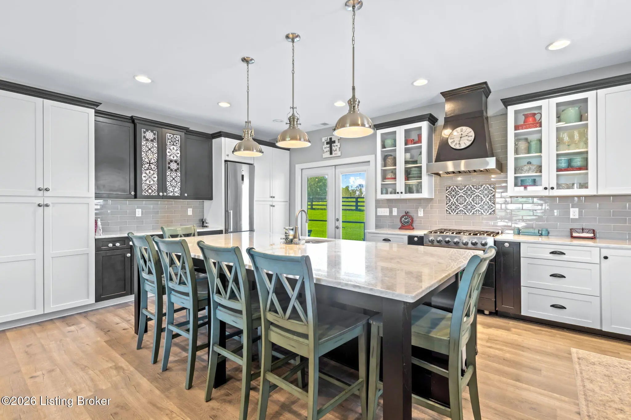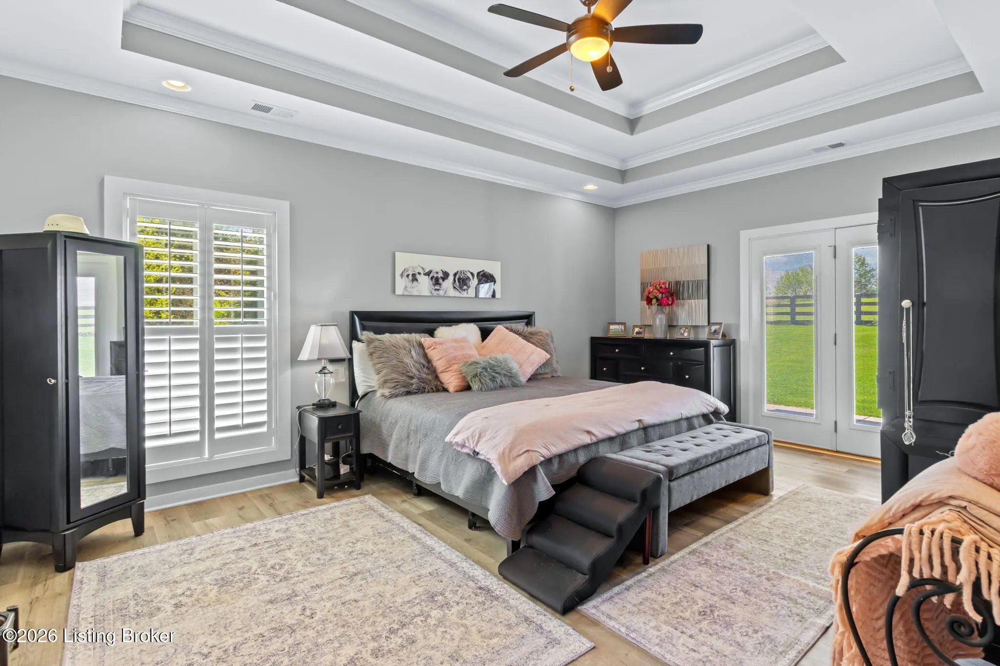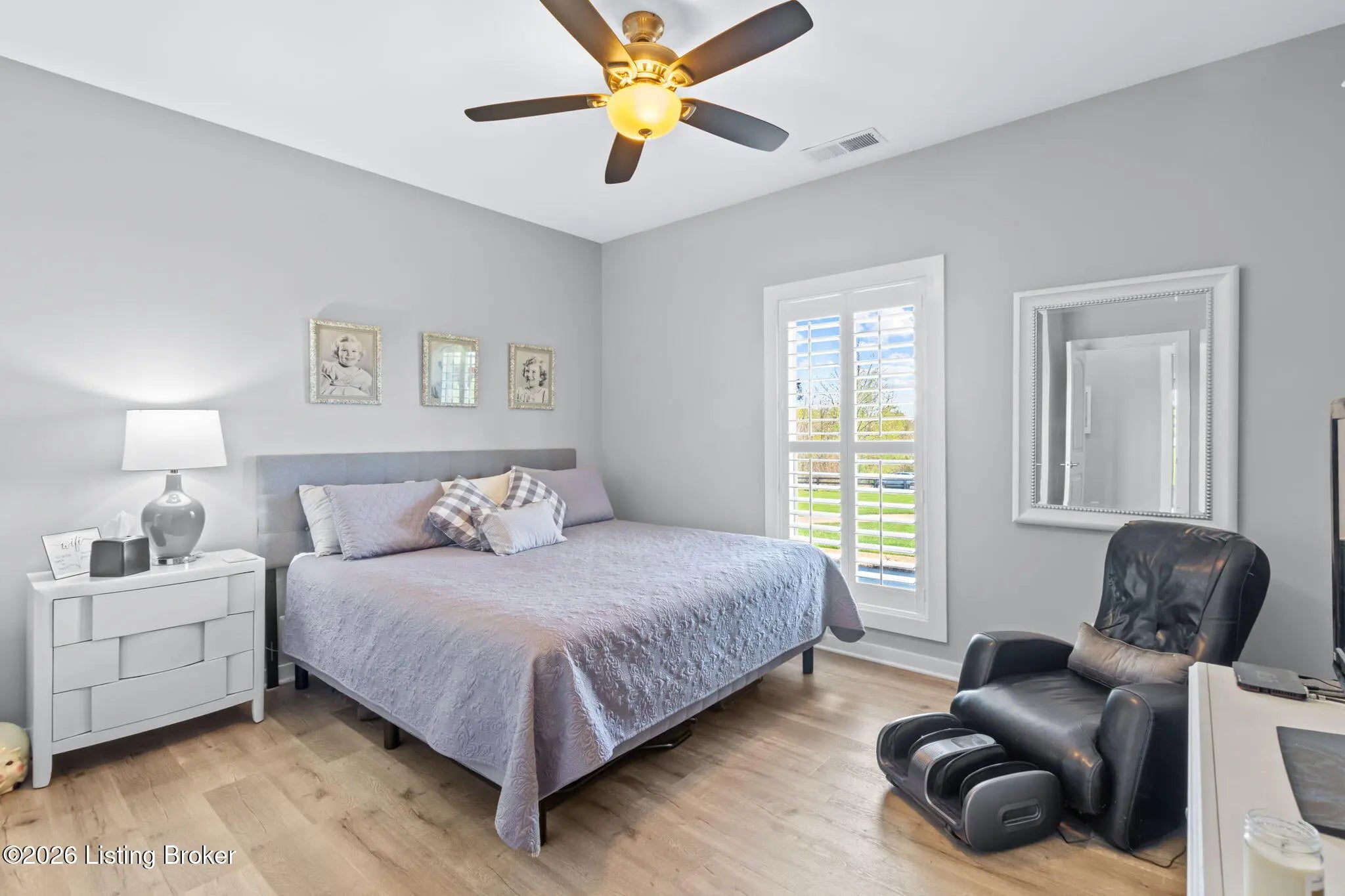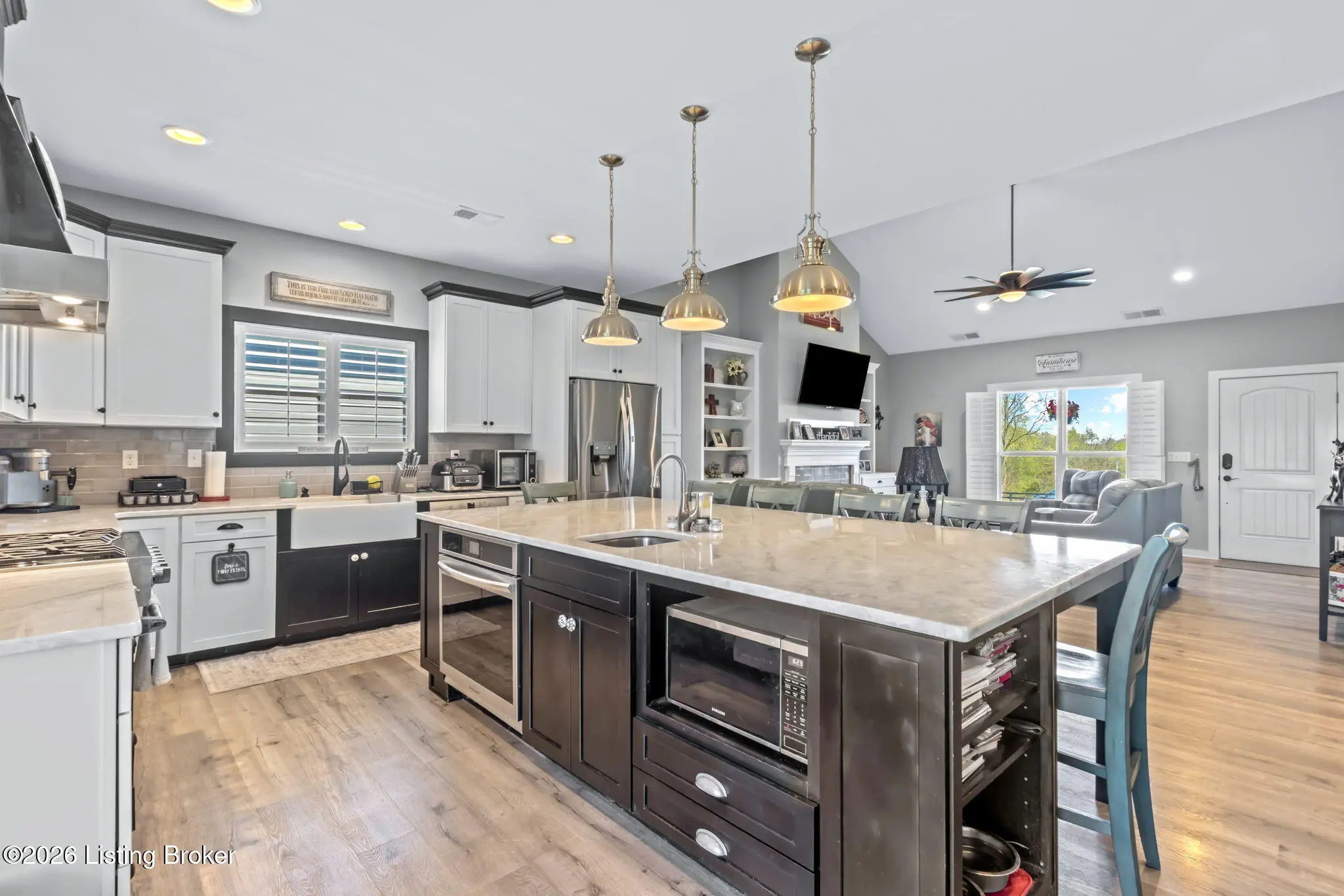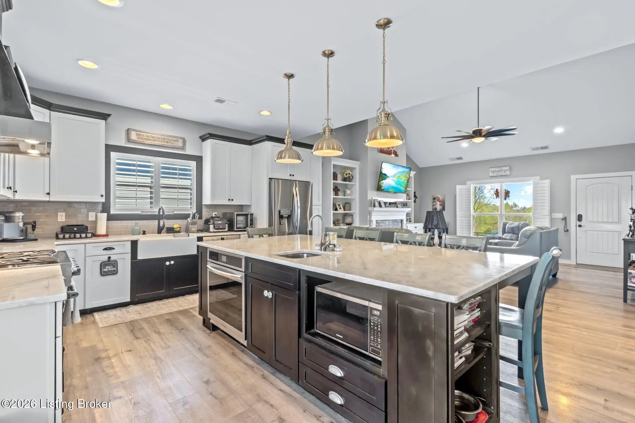 Welcome to your own private slice of Kentucky paradise, this like-new ranch home, built in 2017 and set on 5.5 beautiful acres in Shelby County, offers the perfect blend of modern comfort, low-maintenance living, and peaceful surroundings. From the moment you arrive, you'll appreciate the thoughtfully designed, maintenance-free exterior featuring durable Hardie plank siding and a metal roof built to last. The fully fenced front yard, complete with remote controlled gate and irrigation system, creates a picture-perfect setting while offering both security and convenience. A charming front porch invites you to relax and take in the serene views, while the screened-in back patio overlooks open pasture and wooded areas, ideal for unwinding or entertaining. Inside, the home showcases a bright, open floor plan with wide-plank LVP flooring, plantation shutters, abundant recessed lighting, and upgraded fixtures throughout. The heart of the home is the stunning kitchen, featuring custom cabinetry, exceptional storage, a large center island, and high-end stainless steel appliances, including a 36-inch gas range, double ovens, refrigerator, and a secondary beverage fridge. The kitchen flows seamlessly into the vaulted great room, where a cozy gas fireplace and expansive space create the perfect gathering area. The spacious primary suite is a true retreat, highlighted by a double tray ceiling and direct access to the back patio. The luxurious en suite bath features a large tiled walk-in shower with bench seating, a soaking tub, and an oversized walk-in closet. Two additional bedrooms are generously sized, and the 2nd bathroom offers another large walk-in shower with quality finishes. Additional features include a large two-car garage with a dedicated storage area, pull-down attic access with floored storage space, and a versatile outbuilding perfect for lawn equipment, or easily transformed into a workshop or "she shed." Enjoy the peace and privacy of country living without sacrificing convenience. Ideally located near Shelbyville, Simpsonville, Taylorsville, I-64, the Gene Snyder Freeway, and an abundance of shopping, dining, parks, and family activities, this property truly offers the best of both worlds. Homes like this don't come around often, schedule your private showing today and experience it for yourself.